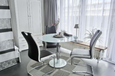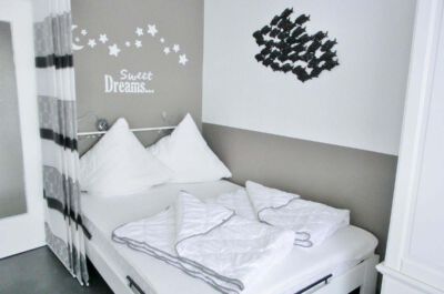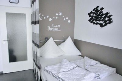 Wohn- / Schlafzimmer: Helles, modern eingerichtetes Wohn/Schlafzimmer mit Laminatboden und direkten Zugang zum Balkon in östliche Richtung. Etwas verdeckt hinter der Tür befindet sich ein Doppelbett (Größe: 140×200 cm) und ein Kleiderschrank. Im Wohnbereich: eine Schlafcouch, Couchtisch, Essplatz für 3 Personen. Zur Unterhaltung steht ein Flachbildschirm, eine kleine Stereoanlage und ein DVD-Player zur Verfügung. Das Fenster ist mit Verdunklungsgardinen versehen.