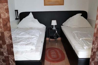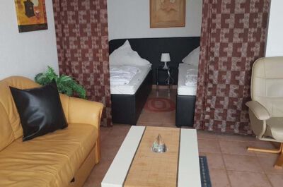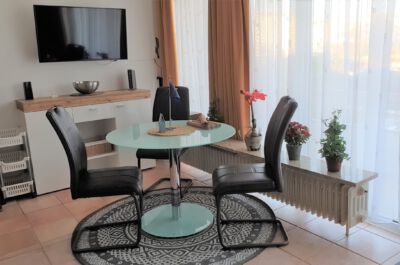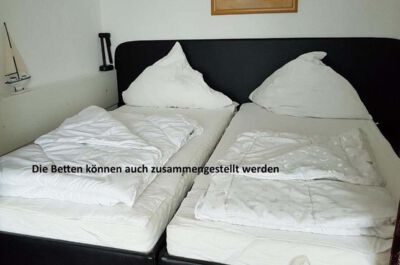 Wohn- / Schlafzimmer: Helles, modern eingerichtetes Wohn- und Esszimmer(gefliest) ausgestattet mit einer Schlafcouch (Größe: 135x200 cm),Essplatz für 4 Personen, Radio, Sat-TV und DVD-Player. Vom Wohnzimmer durch einen Vorhang getrennter Schlafbereich mit 2 Einzelbetten (Größe: 90x200 cm), die auch als ein Doppelbett zusammengestellt werden können. Ein großer Kleiderschrank befindet sich im Flur.