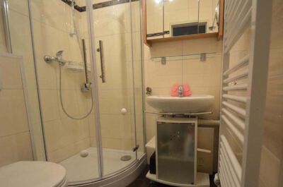Bad: Modernes Bad mit Dusche, WC, Waschbecken.