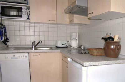 Küche: Die im Wohnzimmer integrierte komplett eingerichtete Küchenzeile ist ausgestattet mit: 4-Platten Ceran Kochfeld, Spülmaschine, Kühlschrank mit kleinem Gefrierfach, Microwelle, mobiler Backofen.