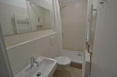 Bad: Freundliches, hell gefliestes Bad mit WC, Waschbecken und Dusche.