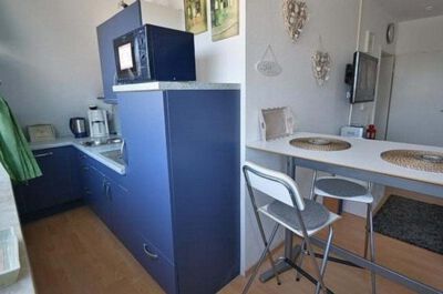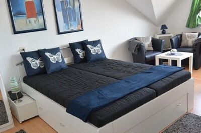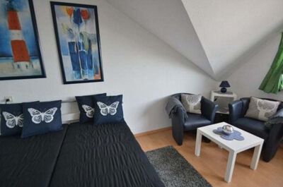 Wohn-/ Schlafzimmer: Helles, modern eingerichtetes Wohn- / Schlafzimmer mit Aussicht auf die Kirchenstraße und teilweise über die Dächer von Grömitz. Das Wohn- und Esszimmer ist mit einer kleinen Essecke, 1 Doppelbett (Größe: 2x80x200 cm), 2 Sessel und einem Kleiderschrank ausgestattet. Die Wohnung ist mit Laminat-Fußboden ausgelegt. Eine Ministereoanlage mit CD, und ein Kabel TV-Gerät sorgen für Unterhaltung.