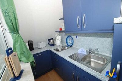Küche: Moderne, komplett eingerichtete kleine Pantryküche mit 2 Platten E-Herd, Kühlschrank, Mikrowelle, Wasserkocher und Toaster.