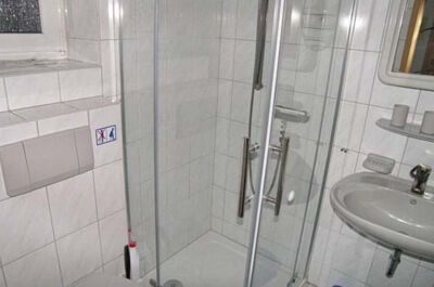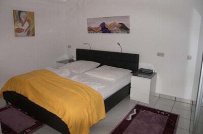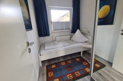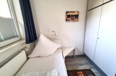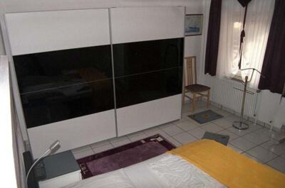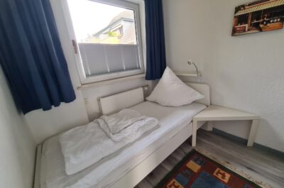 Schlafzimmer: Großes Schlafzimmer mit Doppelbett (Größe: 2x90x200cm) und großem Kleiderschrank. 2 Nachtische, Das Fenster lässt sich blickdicht verdunkeln. gefliest