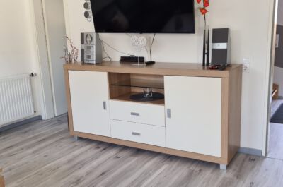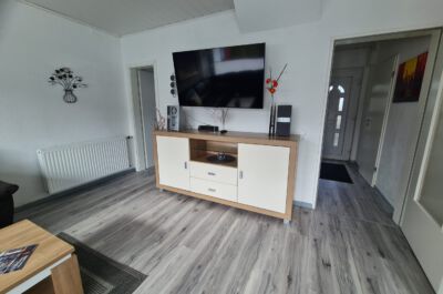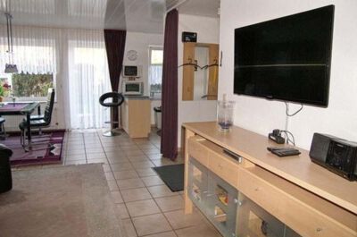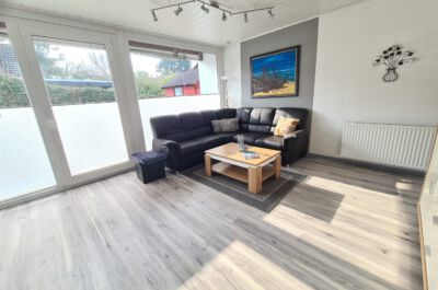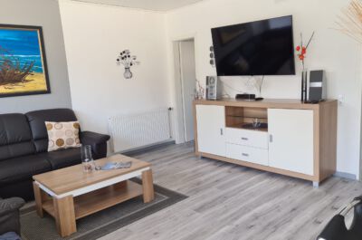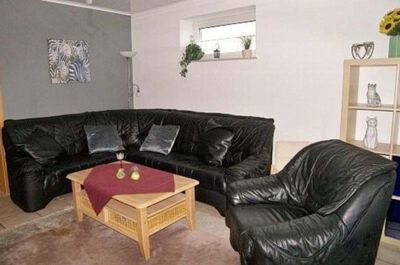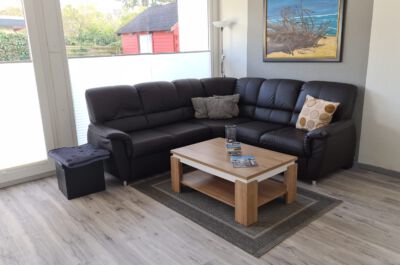 Wohnzimmer: Helles, modern eingerichtetes Wohnzimmer mit Schlafcouch, Radio, Sat-TV, DVD Player, gefliest.