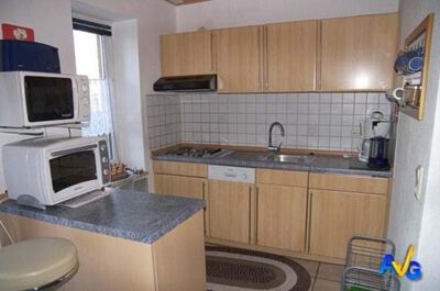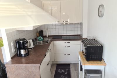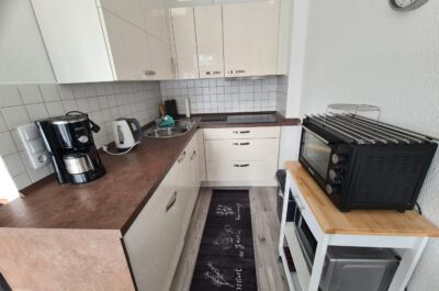Küche: Moderne, komplett eingerichtete, offene Küche mit Spülmaschine, 4 Platten Ceran Kochfeld, mobilen Backofen, Mikrowelle, Kühlschrank mit Tiefkühlfach, Wasserkocher, Toaster