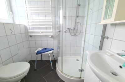 Bad: Modernes Tageslichtbad mit WC, Waschbecken und Dusche.