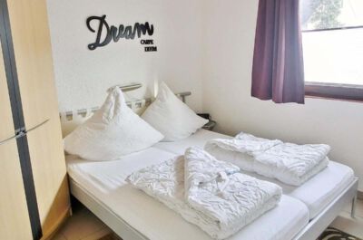 Schlafzimmer: Modernes Schlafzimmer mit Doppelbett. (Größe: 160x200 cm. Das Fenster lässt sich blickdicht verdunkeln
