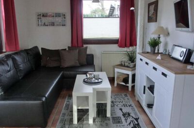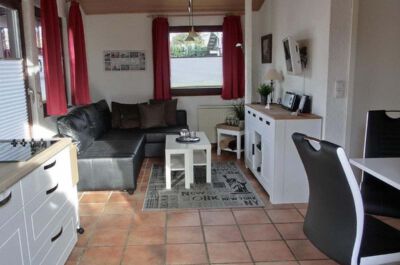 Wohnzimmer: Helles, modern eingerichtetes Wohnzimmer, gefliest, Ledercouch, Couchtisch und Kommode. Zur Unterhaltung gibt es einen Sat-Fernseher, DVD-Player, und kleine Stereoanlage. Weiterhin ist ein Essplatz vorhanden.