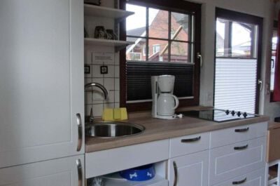 Küche: Moderne, komplett eingerichtete Küche mit 4-Platten E-Herd, mobiler Backofen, Mikrowelle, kl. Spülmaschine, Kühlschrank mit Tiefkühlfach, Wasserkocher, Toaster