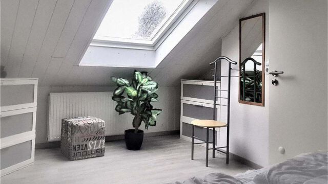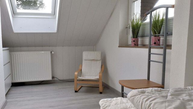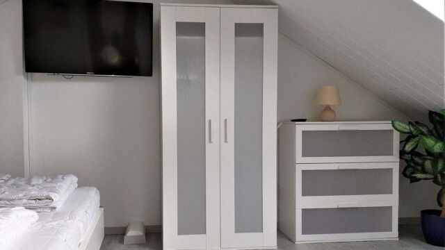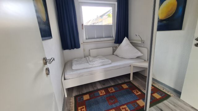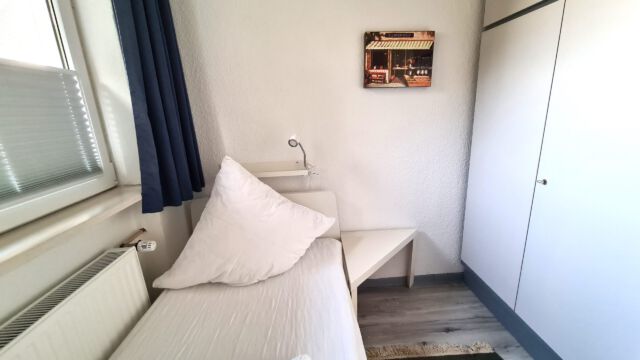 Im Erdgeschoss befindet sich ein Gästezimmer mit Einzelbett ( 90x200) und Kleiderschrank.