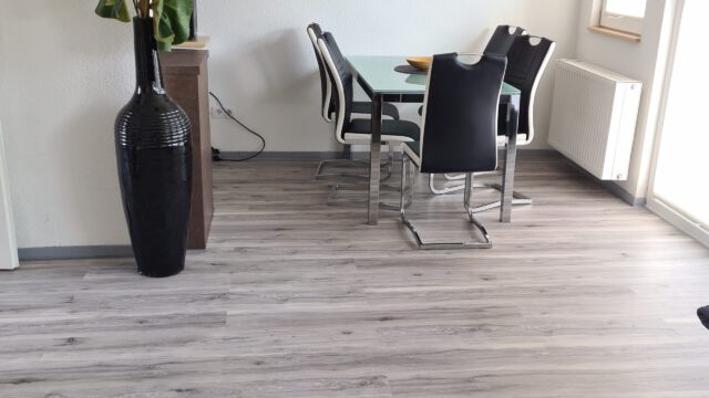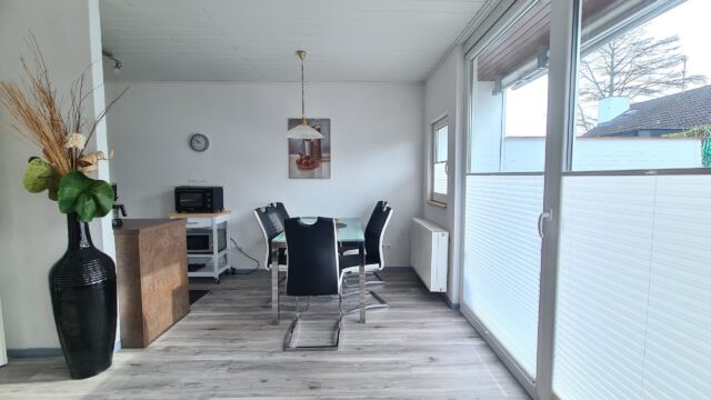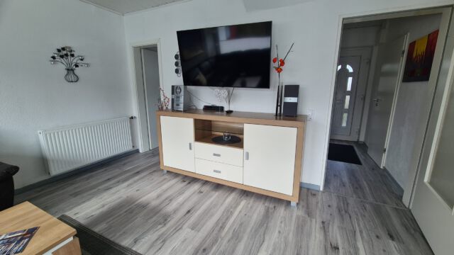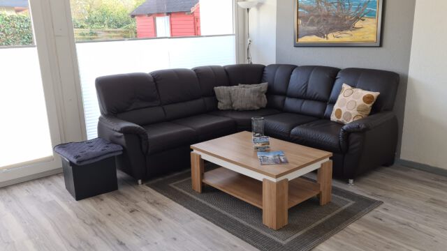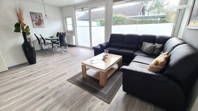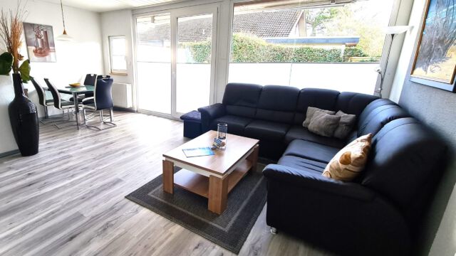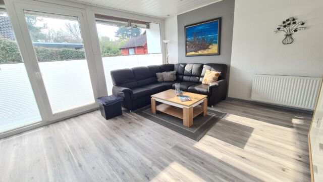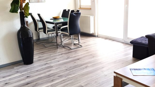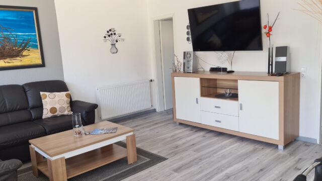 Wohnzimmer: Das große modern ausgestattete Wohnzimmer (Vinylboden) mit SAT-TV und Radio befindet sich im Endgeschoss.
