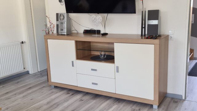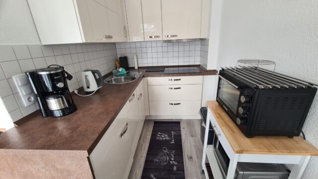 Küche: Eine abgeteilte, komplett ausgestattete Küche mit Essgruppe ist im Wohnzimmer Integriert. Es gibt ein 4 Platten Ceran-Kochfeld eine Spülmaschine, Kühlschrank mit Gefrierfach ,Mikrowelle, Wasserkocher, Kaffeemaschine, Toaster sowie einen mobilen Backofen.