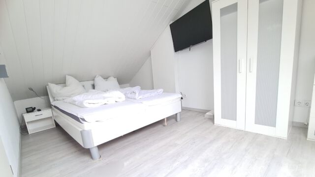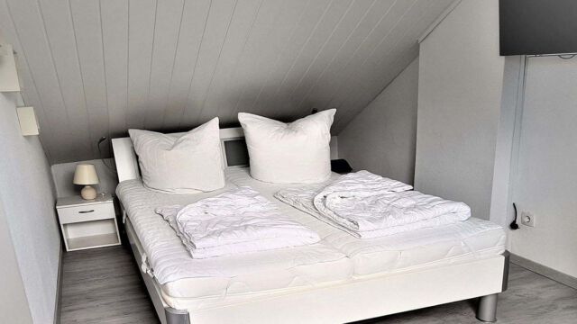 Schlafzimmer: Das Schlafzimmer mit Doppelbett (Größe: 2x80x200 cm) und Kleiderschrank mit Verdunkelungsrollo und Vinylboden befindet sich im Obergeschoss . Bettwäsche und Handtücher sind mitzubringen oder mietbar