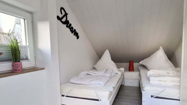 Kinderzimmer: Das Kinderzimmer ist mit 2 Einzelbetten (Größe: 80×200 cm) und einem Schrank und ausgestattet und befindet sich im Obergeschoss.