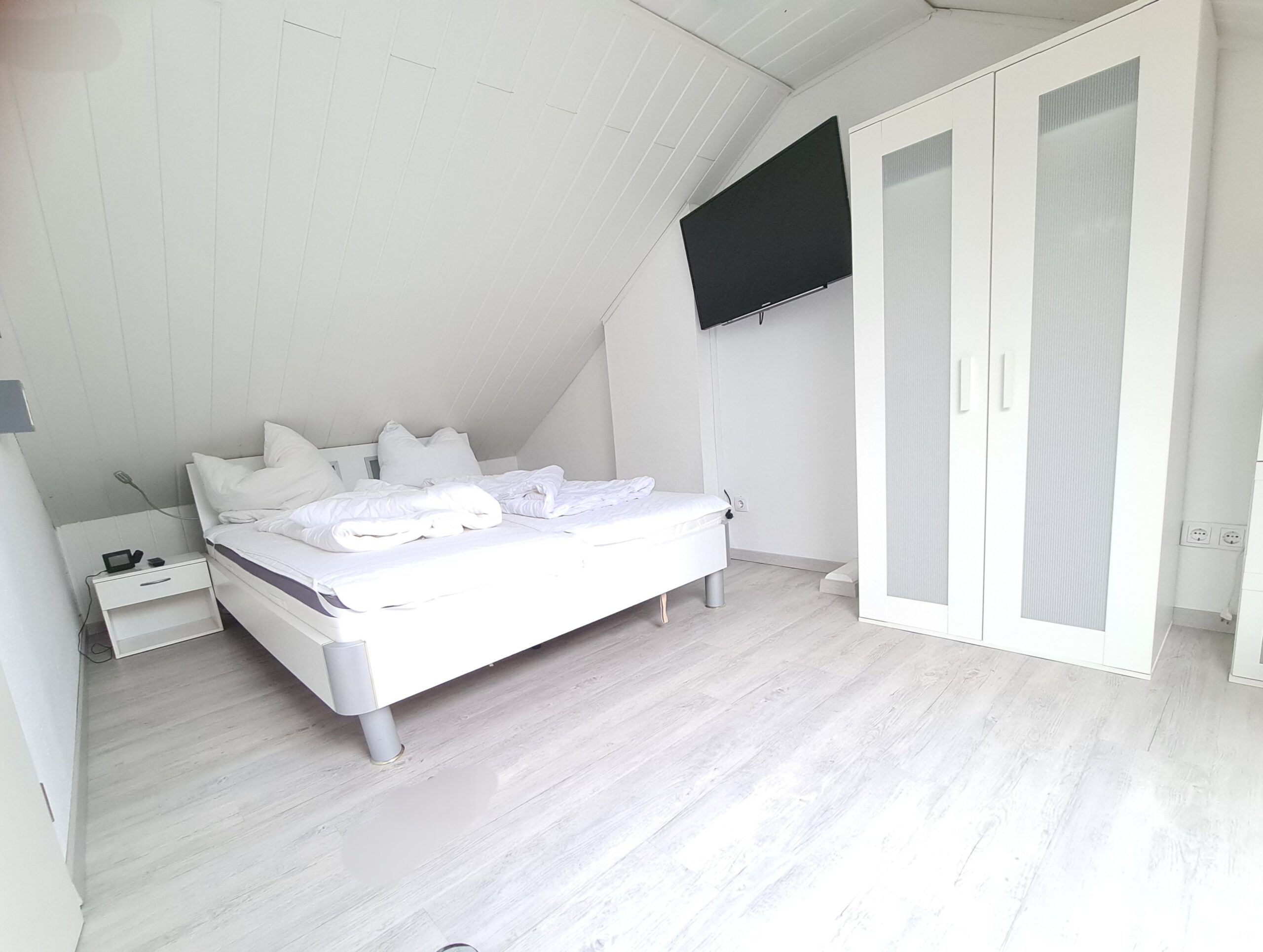 Schlafzimmer: Das Schlafzimmer mit Doppelbett (Größe: 2x80x200 cm) und Kleiderschrank mit Verdunkelungsrollo und Vinylboden befindet sich im Obergeschoss . Bettwäsche und Handtücher sind mitzubringen oder mietbar