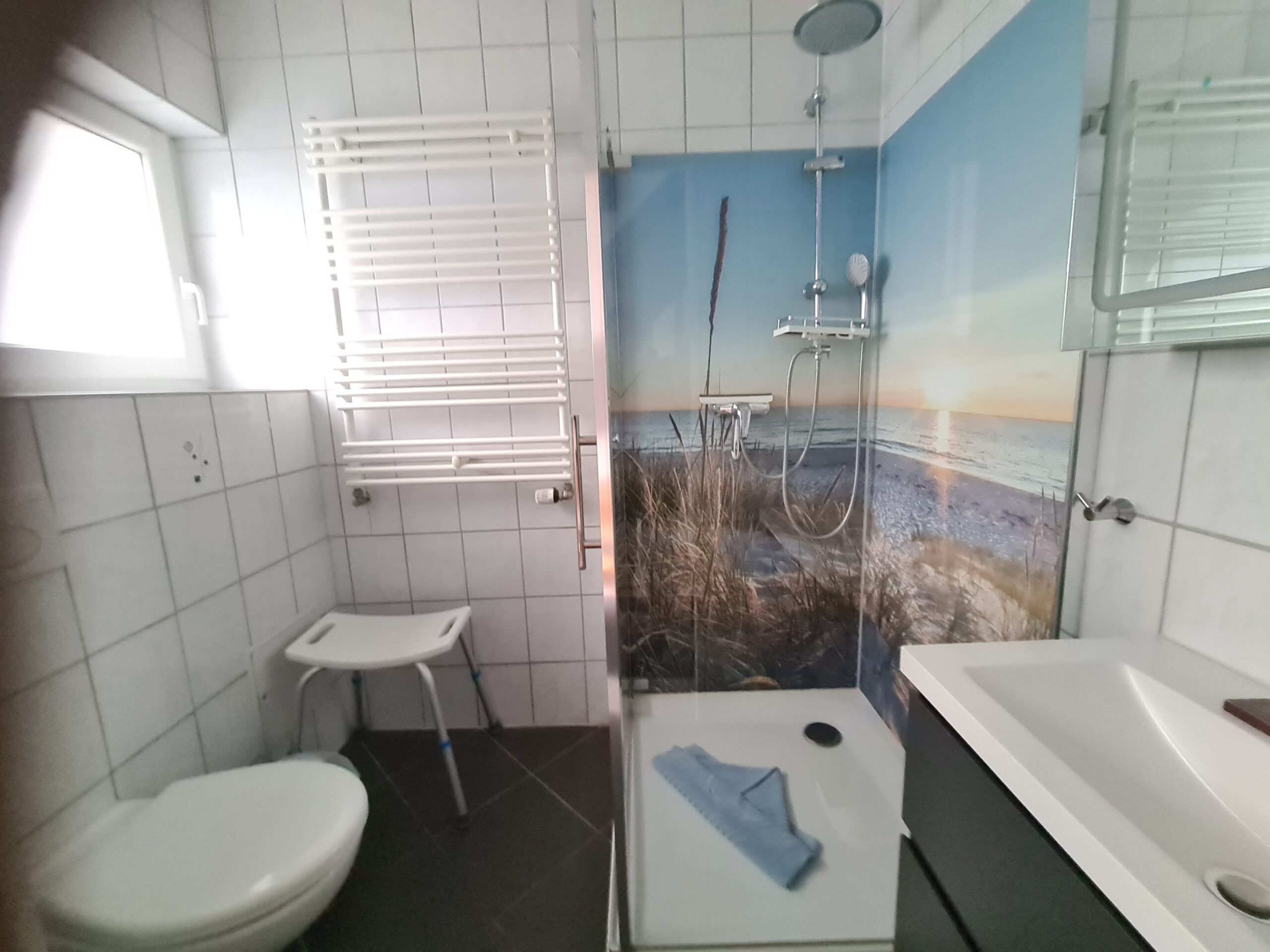 Bad: Modernes, gefliestes D-Bad mit Tageslicht.